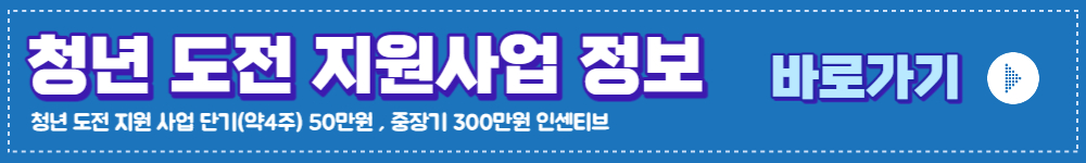 ▶ 접수방법 : 워크넷 홈페이지 신청 (자세한 신청 방법은 청년 도전 지원사업 정보에 있습니다.)